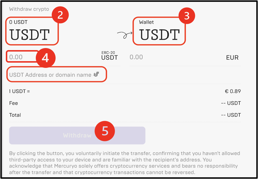 - Enter the amount & wallet address where you want to send the crypto to (the wallet address must be the one given to you during the sell request)